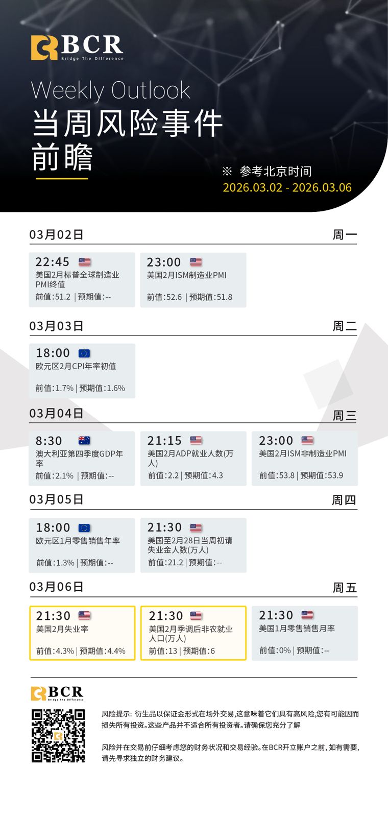 风险披露:衍生品在场外交易,采用保证金交易,意味着具有高风险水平,有可能会损失所有投资。这些产品并不适合所有投资者。在进行交易之前,请确保您充分了解风险,并仔细考虑您的财务状况和交易经验。如有必要,请在与BCR开设账户之前咨询独立的财务顾问。
