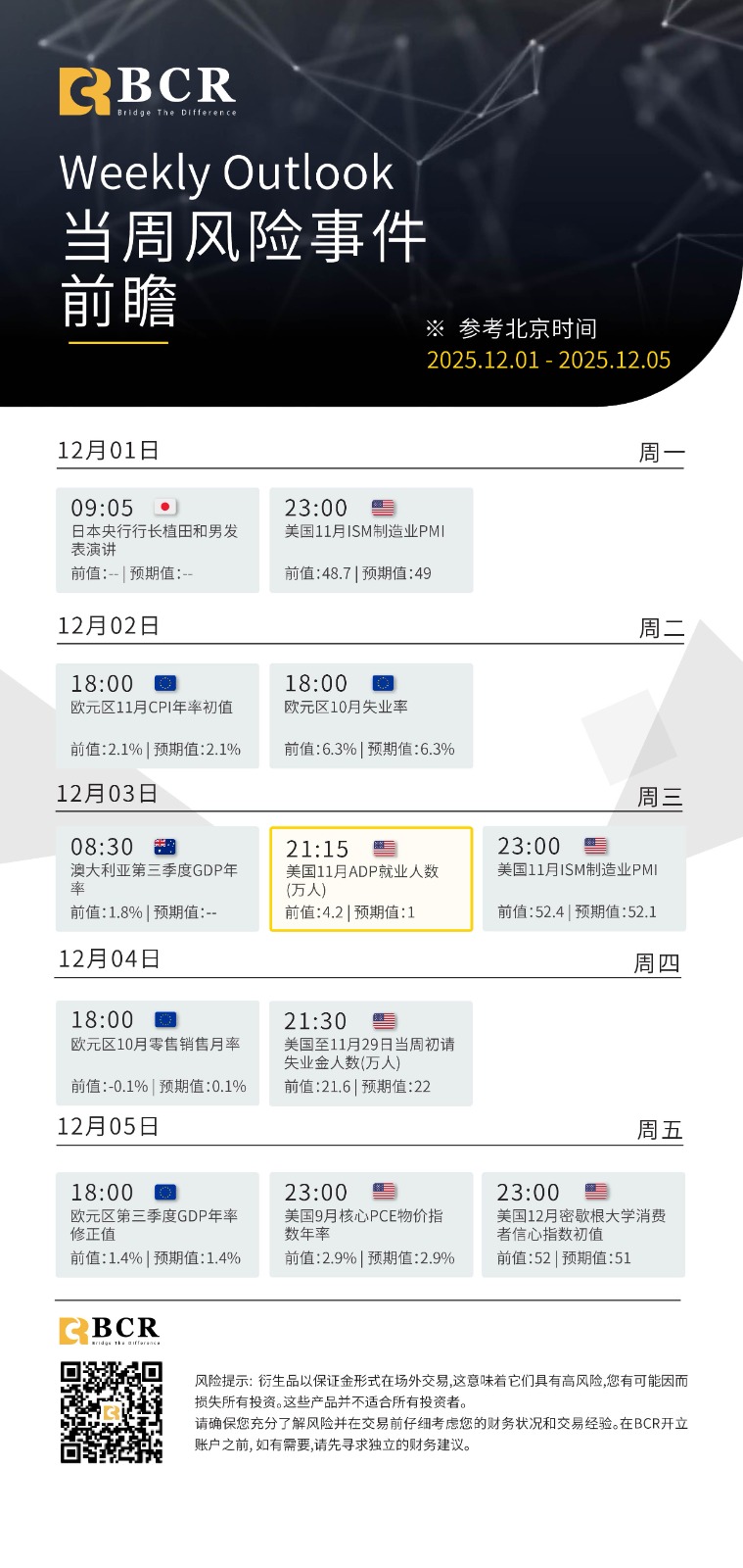 風險披露:衍生品在場外交易,採用保證金交易,意味著具有高風險水平,有可能會損失所有投資。這些產品並不適合所有投資者。在進行交易之前,請確保您充分了解風險,並仔細考慮您的財務狀況和交易經驗。如有必要,請在與BCR開設帳戶之前諮詢獨立的財務顧問。